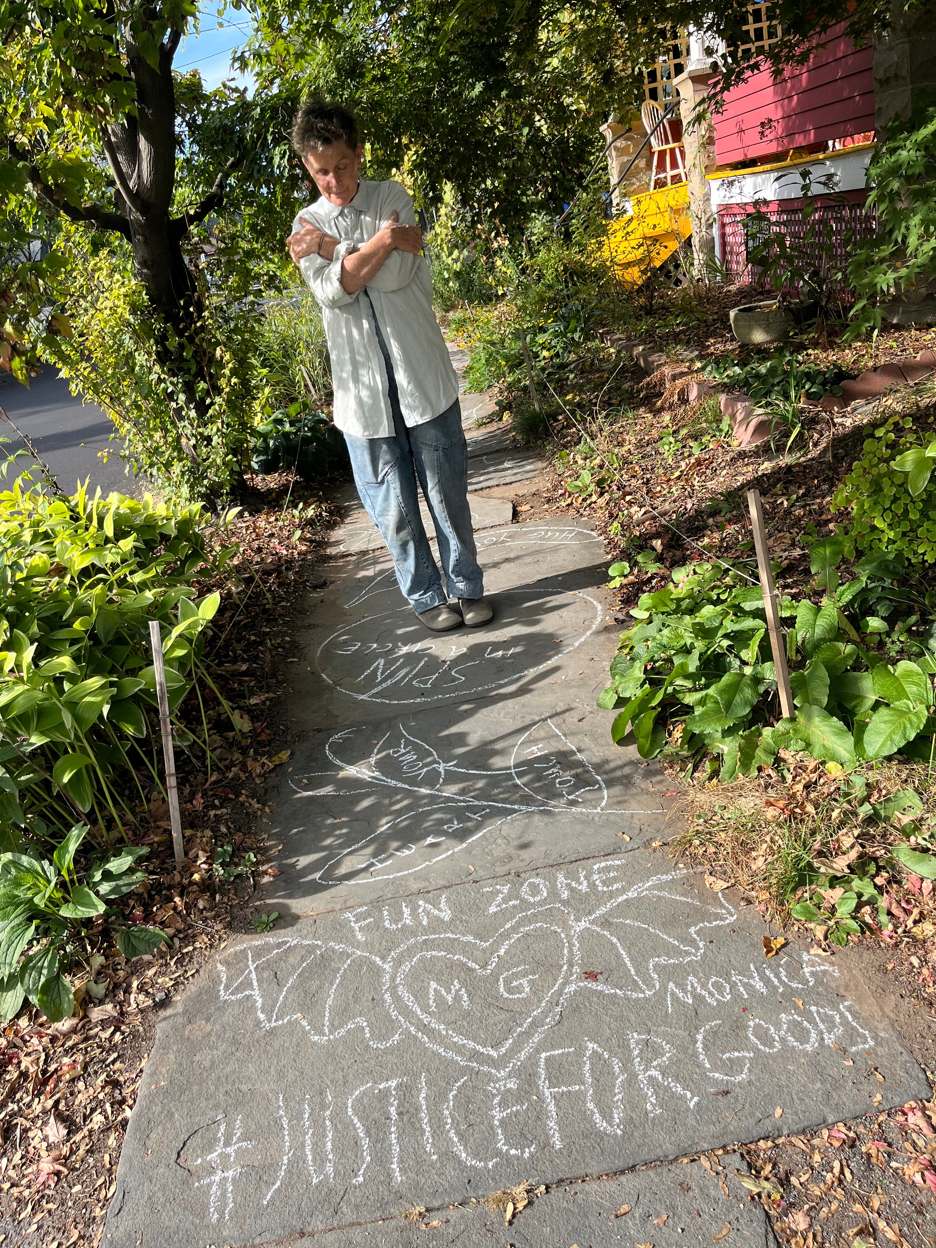 (I have to walk my dog, or I’d spend time talking about Jenny, how she made a 16 panel chalk-drawing walkway right in front of my house, each of the 16 panels a suggestion of something we can do with our bodies/souls while we remember Monica Goods. Monica Goods who would’ve been 16 this year if she hadn’t been killed by a local police officer. Justice still has not been brought. Want to know more? Go here: #justiceformonicagoods. Photo by Jenny.)